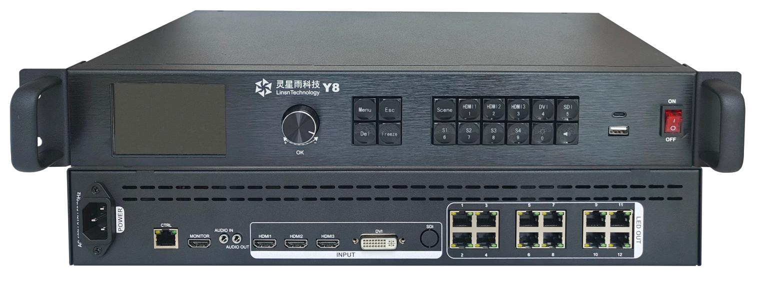 Y8-312三画面二合一处理器是灵星雨研发的一款 4K 的 LED 显示屏控制设备。单台设备最大带载 780 万像素点, 支持多种视频信号接口,具备 12 个千兆网口输出。